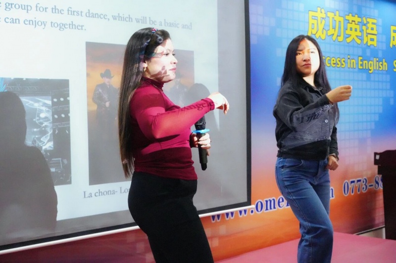 国际伙伴们,耐心分解着萨尔萨舞步,师生们则认真模仿。