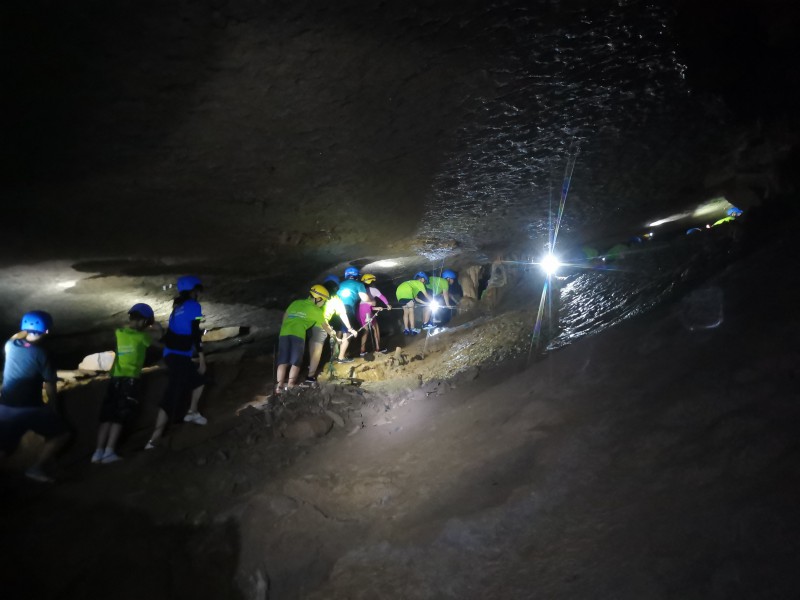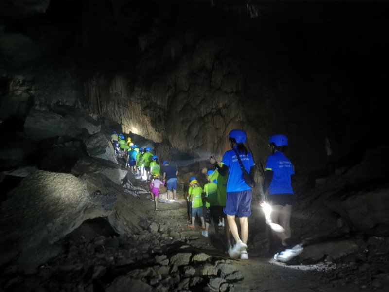 洞内漆黑一片,脚下是清凉的地下水,同学们头上的头灯是洞内唯一的亮光,洞里的石钟乳形态各异,奇丽无比,相信同学们能深刻体验到大自然的鬼斧神工。