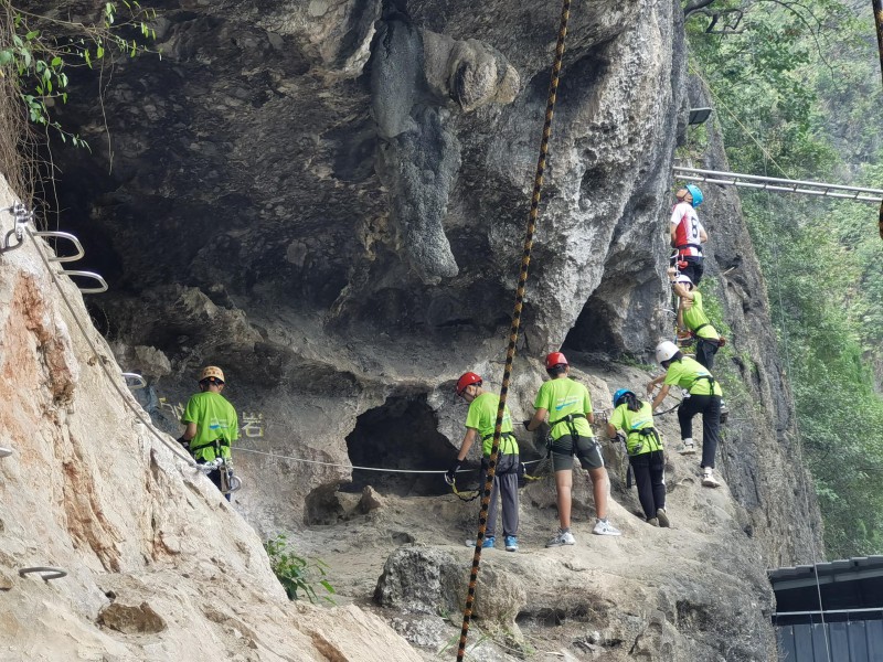 飞拉达是意大利文Via Ferrata的音译,指的是在山体岩壁上建设,由钢扶手、脚踏、生命钢缆等构成的攀岩径道。我们对这个概念都不太了解,对这个活动也很是期待。此次活动的地点是在千古情景区附近,距离不远,便步行前往。