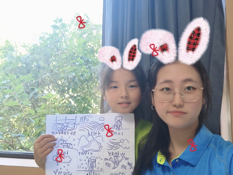 Amy以及Apple正在和外国志愿者Afnan进行口语交流。她们已经褪去了最开始与陌生人交流害羞的样子,成为能够主动与外国志愿者找话题的“小小大人”了。从最开始只能说最简单的单词到现在可以向别人用句子介绍自己,你们付出的汗水与回报一直都深深地让老师感触。